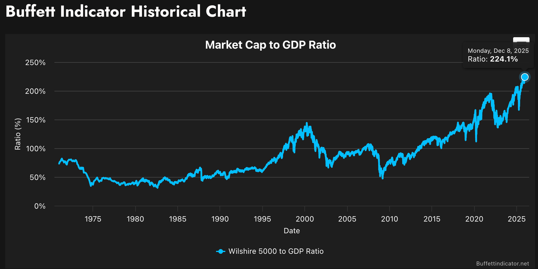 When you look at the Buffett indicator for the U.S. today, it is extremely elevated. According to GuruFocus, the ratio of total U.S. market cap to GNP stands at about 224.1% as of December 2025, essentially matching its all‑time high (the previous peak was roughly 224.2% in November 2025). That puts the U.S. market in the “Significantly Overvalued” bucket – we’d be comfortable describing it as strongly or even extremely overvalued. For comparison, during the dot‑com bubble peak in early 2000 the Buffett indicator was materially lower than it is today, even though that period is now a textbook example of an equity bubble.
