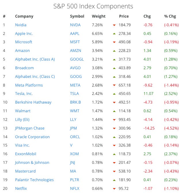 The S&P 500 is not an evenly balanced basket of 500 companies; it is heavily dominated by a handful of mega‑caps. As of late 2025, the so‑called “Magnificent 7” (Apple, Microsoft, Alphabet, Amazon, Meta, Tesla and Nvidia) alone account for well over a quarter of the entire index’s market value, and the top twenty constituents together make up almost 50% of the index (49.84%, to be precise).