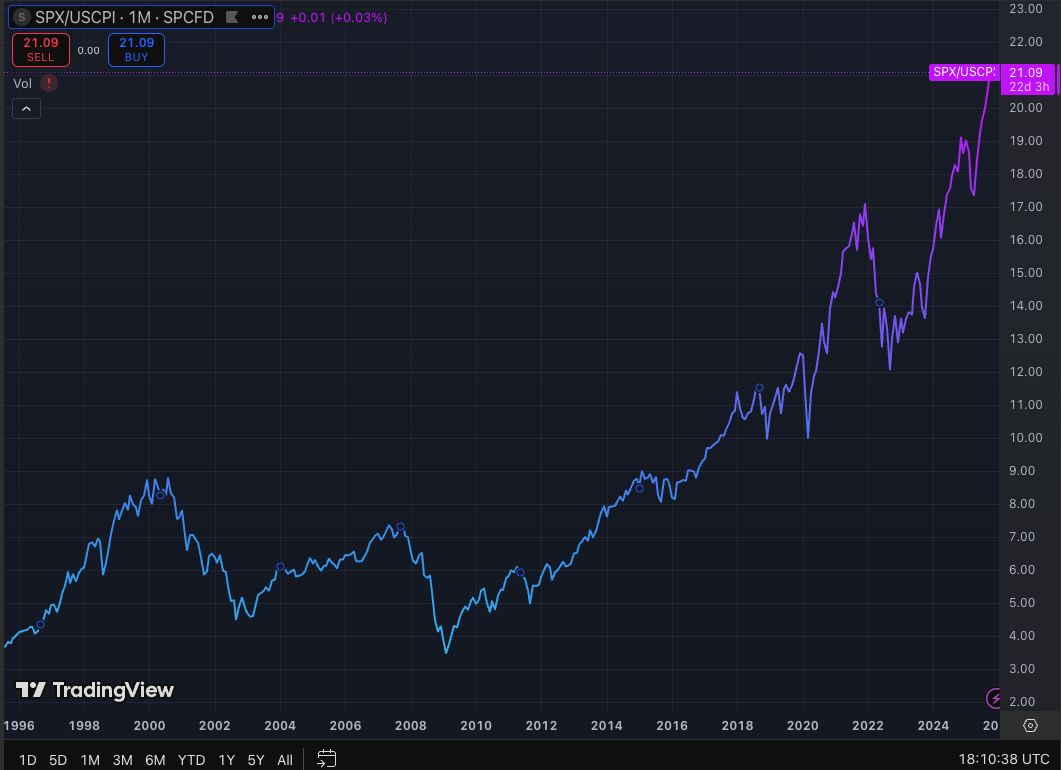 And we can see it on the chart, too. Below is the S&P 500 adjusted for U.S. inflation (the formula used in TradingView is SP:SPX/ECONOMICS:USCPI).