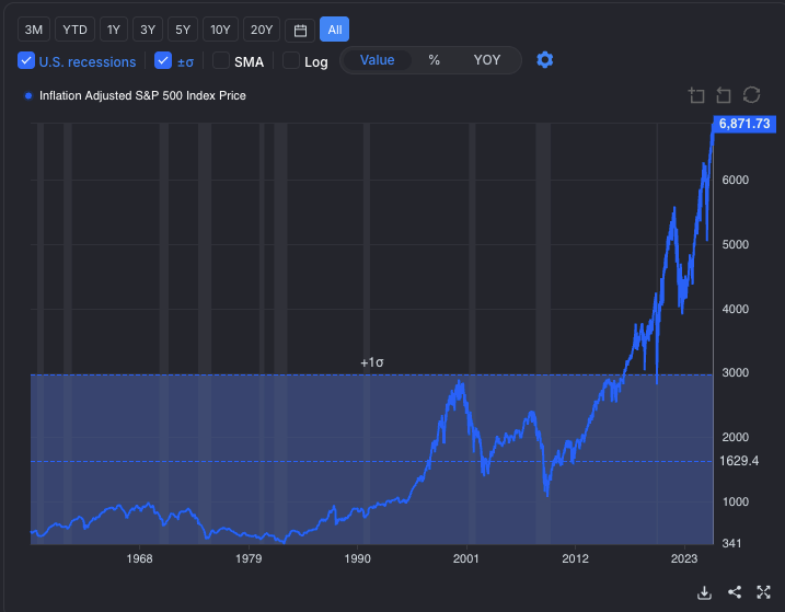A different way to see the same point is to look at GuruFocus’s inflation‑adjusted S&P 500 chart, which plots the index together with its long‑term average and a “normal” band around that average (one standard deviation). Today’s inflation‑adjusted S&P 500 is not just above its historical mean—it is far, far beyond this usual band. In plain language, the current real price level is statistically extreme relative to what has been normal over past decades, even after accounting for inflation.