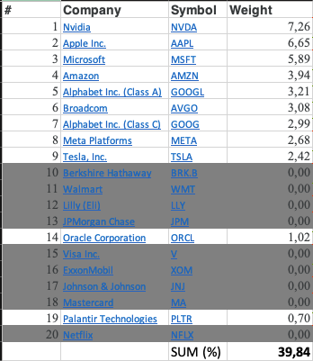 But that’s for the top twenty companies, a group that also includes more traditional conglomerates like Warren Buffett’s Berkshire Hathaway or Johnson & Johnson. We therefore decided to tweak this 20‑stock group: starting with the Magnificent 7 and then extending it to include a few other AI‑related and likely overvalued names, while excluding more “boring” blue chips such as Berkshire or Visa. The final group looks as follows:
