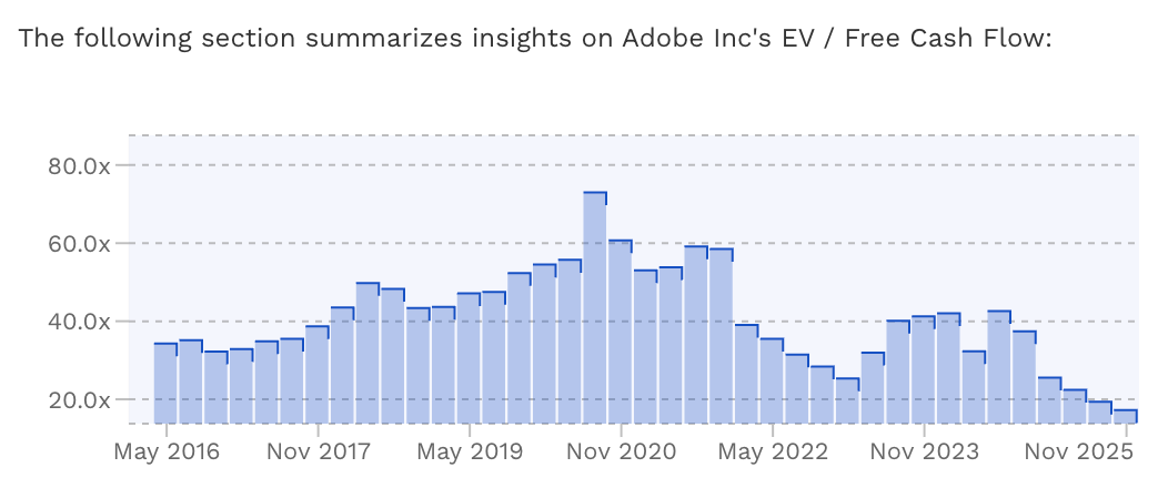 And for completeness, looking at Adobe’s Enterprise Value / Free Cash Flow, we can see that in November 2025 it was trading at historical lows (Adobe’s EV/FCF hit 13.6x at 28 Nov), underscoring how cheaply the market was pricing each dollar of the company’s free cash generation relative to prior years:
