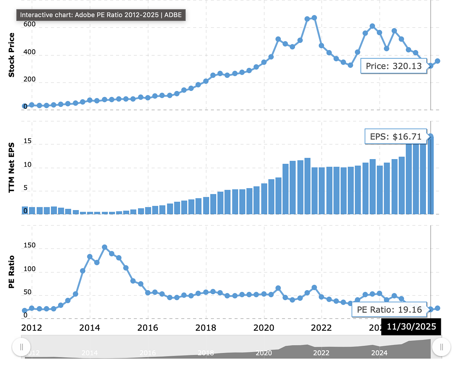 Fast forward to now: at the end of November 2025, Adobe was down to $320.13 – nearly half of what people were willing to pay in November 2023: