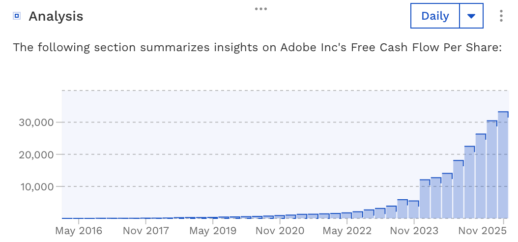 Note: The chart above is sourced from finbox.com and shows FCF per share, which finbox defines as levered free cash flow on a per common share basis. Since terms like “free cash flow” can vary across sources and Adobe itself emphasizes operating cash flows, we use these figures primarily to illustrate the general trend in cash generation rather than as a strict, universally standardized metric.